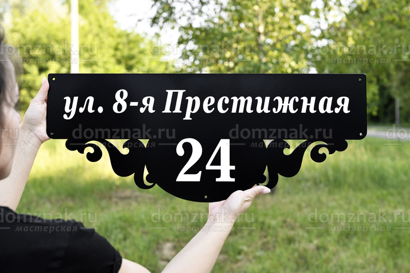 Фото №-А Если Вам ищите табличку со спокойным и лаконичным дизайном, предлагаем присмотреться к данному образцу. В данный артикул хорошо поместится адрес любой длины, а оформление не отвлекает на себя внимание.