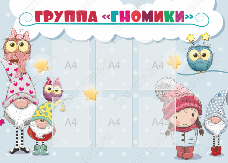 Стенд «Группа гномики» для детского сада безусловно станет его визитной карточкой. Если ваша группа оформлена в сказочном стиле, то стенд с милыми гномиками – это именно то, что вам нужно. Этот прекрасный стенд добавит интерьеру индивидуальности, ярких и веселых красок и превратит проведенное малышом время в путешествие по сказочному миру.