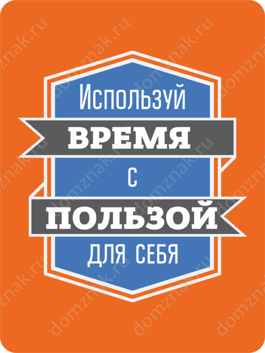 Табличка «Используй время с пользой для себя» изготовлена из пластика ПВХ, толщиной 4 мм. Изображение наносится по технологии УФ-печати. Табличка предназначена для использования как в помещении, так и на улице.